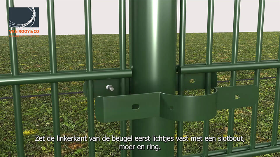 Plaats de beugels aan de bovenkant en onderkant van de mat (bij hogere hekken ook in het midden).