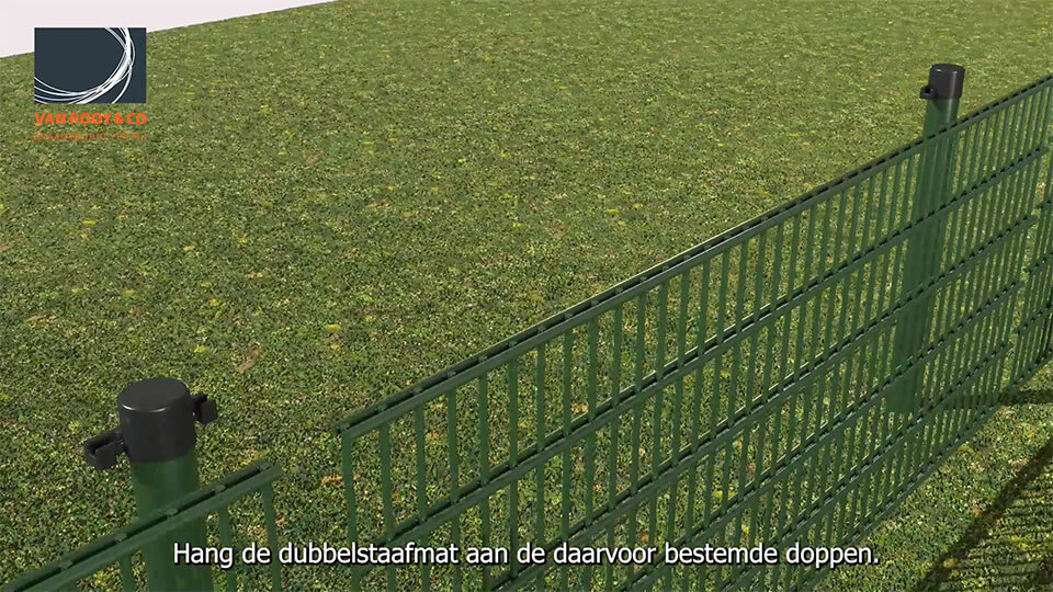 Hang de dubbelstaafmat aan de doppen van de palen.
