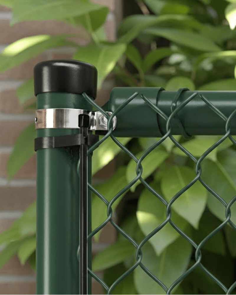 De einddop wordt op het uiteinde van de bovenbuis van 42 mm geschoven. Het oog van de einddop wordt vervolgens met de meegeleverde RVS eindbeugel aan de paal van 60 mm bevestigd. Hiermee wordt de bovenbuis op zijn plek gehouden en kan het harmonicagaas strak worden opgespannen. De montage is eenvoudig en vereist geen speciaal gereedschap.