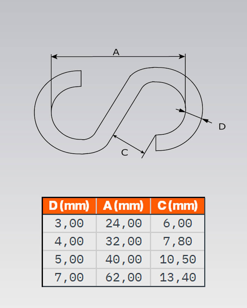 Bij het kiezen van een S-haak is het belangrijk om te letten op de afmetingen. In de productspecificaties worden drie maten aangegeven: A, C en D. Deze bepalen of de haak geschikt is voor uw toepassing.